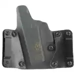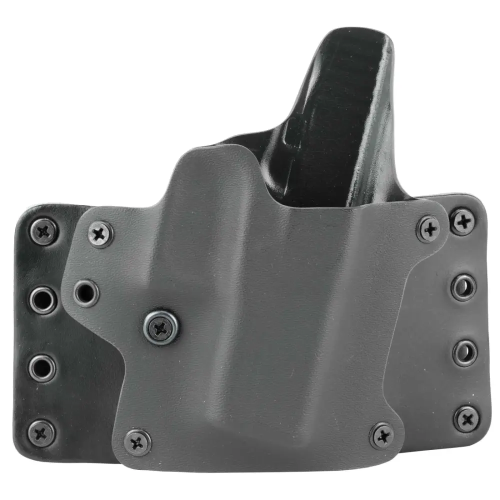 The thin mounting profile of the Leather Wing allows for OWB concealment. The Leather Wing was designed to retain the most popular features of a Kydex holster, while improving the fit and comfort of the holster to the body through the addition of leather wings. The belt loops of the holster are attached to these wings and the belt of the wearer then threads through the loops on the leather wings. This configuration allows for a much slimmer and more comfortable fit. A tension Screw allows for quick adjustment of holster retention within set range. Thread Locker is applied to all screws to prevent loosening over time. All OWB holsters can be converted to IWB by removing the OWB loops from the back of the holster and attaching IWB loops to the front of the holster. Made in the USA.