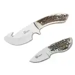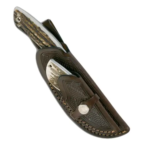 Hunter Knife Combo includes the 510H Gut Hook knife and BA530 Caper knife. Both knives have a stag handle. Combo leather sheath included.
