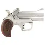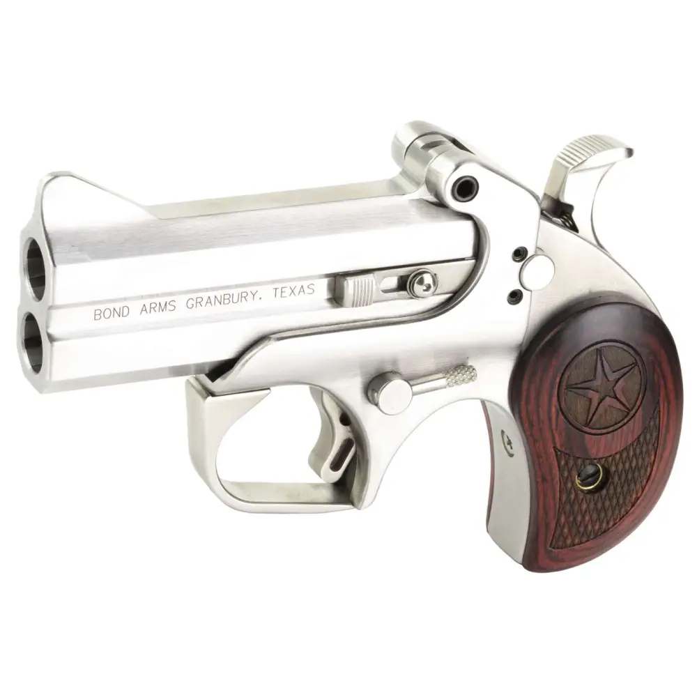 The Century 2000 by Bond Arms is a derringer that's compatible with 3" or 2.5" 410 shotshells or 45 Colt ammunition. The Century 2000 accepts all Bond Arms interchangeable barrels and features a cross-bolt safety, a trigger guard, and rosewood stocks. The spring-loaded cammed locking lever allows for a tighter barrel/frame fit and rapid loading and unloading.