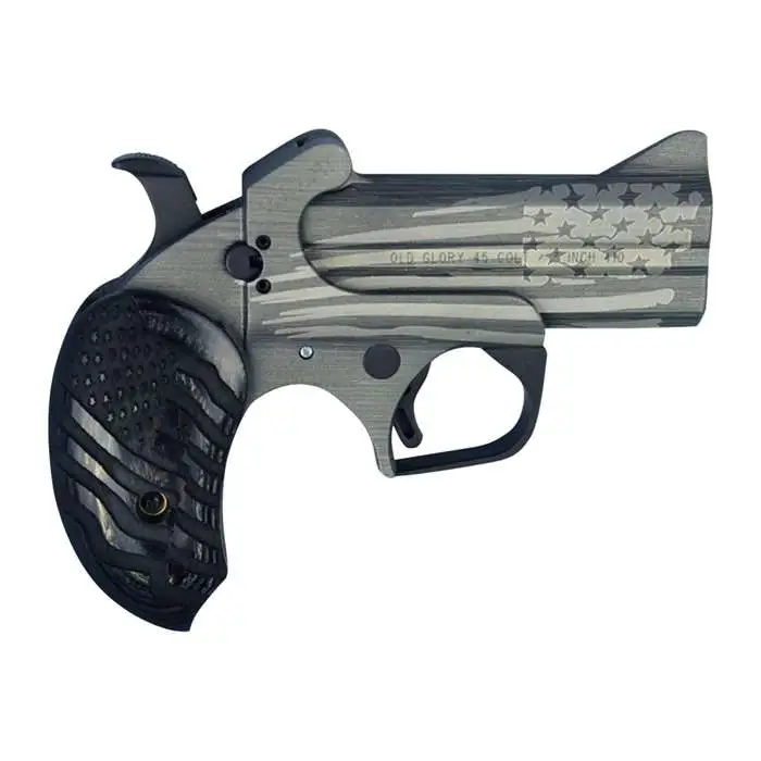 Bond Arms' "Old Glory" features a full Cerakote finish with the American Flag laser engraved across the barrel and frame. The extended black ash grips are custom engraved with the American Flag. The Old Glory has a 3.5" barrel chambered in .45LC/.410 with a blade front sight and fixed rear sight. The Old Glory has a stainless steel double-barrel and frame, and is compatible with all standard Bond Arms barrels. It has an automatic spent casing extractor, patented rebounding hammer, retracting firing pin, crossbolt safety, and a spring-loaded, cammed locking lever. Old Glory Packages include an additional barrel and a holster. Old Glory Package 2 includes a second Cerakoted barrel in 357/38 and a Bond Arms black leather driving holster.