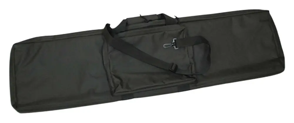 Bob Allen's 36" Black Rectangular Tactical Rifle Case is water resistant. Made of coated poly with poly webbing and has an external magazine storage pocket (10X9). The case has self healing nylon zippers, foam padding and poly webbing carry handles and shoulder strap.
