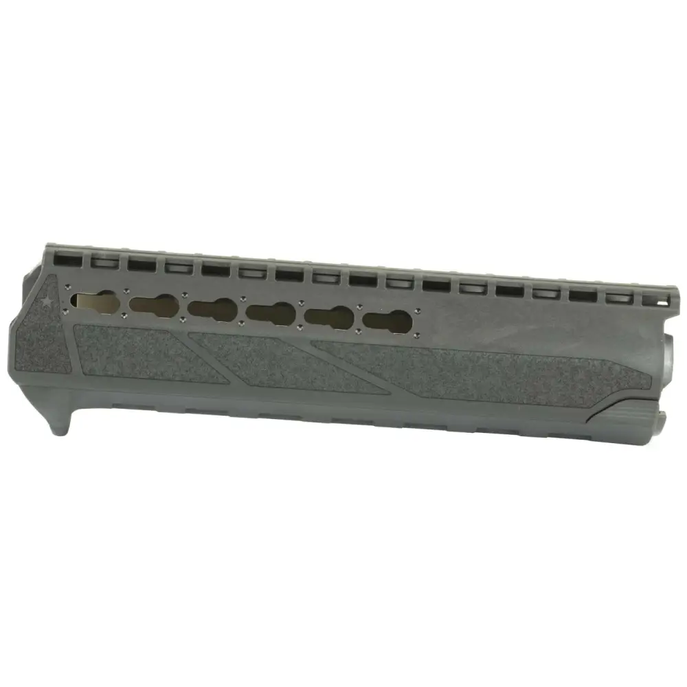 This BCM PKMR handguard is a direct replacement featuring a simple drop-in design. It is for a mil-spec, M4 type AR15 with a mid length gas system and mil-spec front sight base. The PKMR handguard has a slim and lightweight design and features reinforced KeyMod mounting surfaces for durable accessory support. This handguard also features an aggressive textured area for enhanced traction and has an aluminum heat shield to reduce heat transfer to the handguard and the shooters hand. This PKMR model will only fit a triangle M16 type handguard retaining cap. This mid-length model has a black finish.