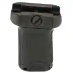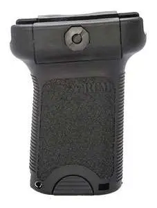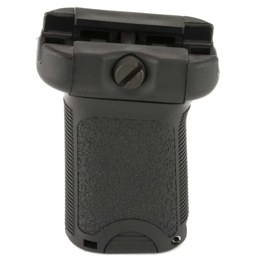 This vertical short grip has a low-profile length for increased mobility and decreased "snag" factor. The forward angle increases the rigidity of the forearm, while providing a more natural wrist angle. Its aggressive texture and storage volume combined with modular design allows for improvements and adaptation in the future. Included is a cross bolt designed to work with improvised tools to allow for easy adjustment or re-tightening, reversible clamps which allows users to set up fasteners to reside on either side, and a spring-loaded clamps that makes installation and removal easier.