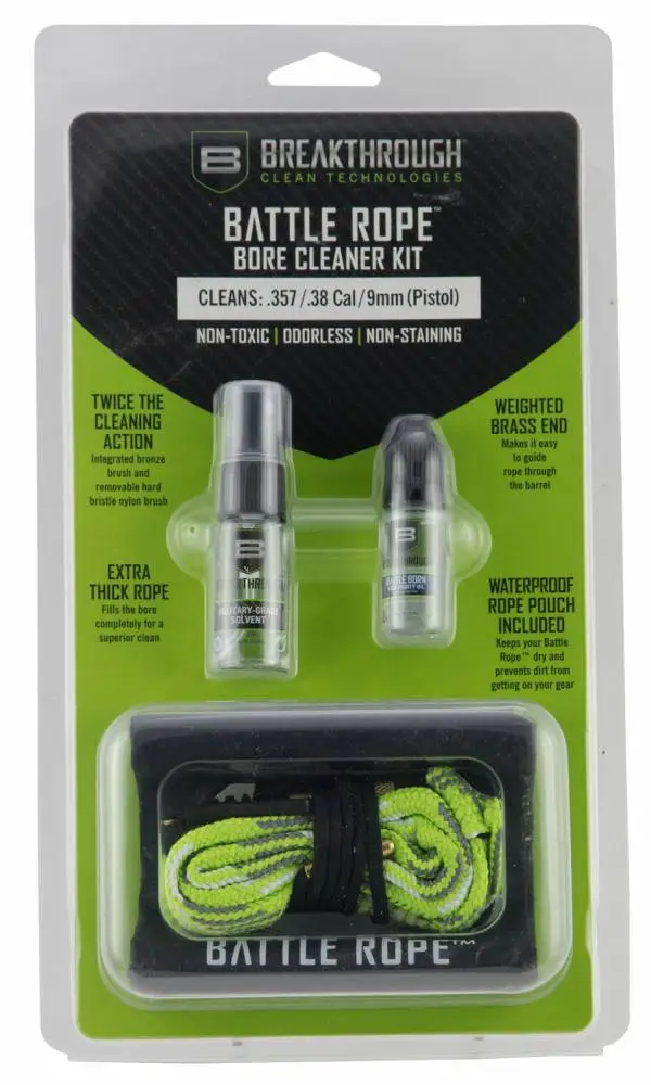 The Breakthrough Clean Battle Rope are available to cover all your firearm cleaning needs. Designed to better clean the bore of your firearm, the Battle Rope's integrated bronze brush and detachable hard bristle nylon brush provide twice the cleaning action. The threaded brass link allows for quick detachment of the hard bristle nylon brush for ease of cleaning the rope and its weighted brass end makes it easy to guide the rope through the barrel. The Battle Rope features a patented flex cable section allowing you to pass the rope through the ejection port without having to field strip your firearm. Thicker than other leading brands, the Battle Rope fills the bore completely for a superior clean and its caliber tag makes it easy to always identify the rope you are using.