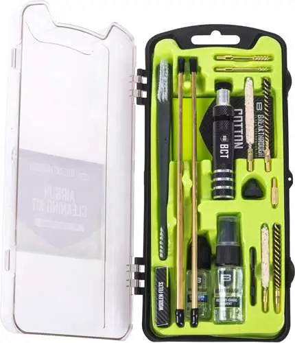 This Airgun cleaning kit come with four (4) brass rods, handle, 3 brushes ( (2)bore brush, double end brush), (2) cotton mops, muzzle guard, brass patch holder, (2) brass jags, box of patches, box of woolen felts, an adapter, 15ml bottle of Breakthrough military grade solvent, and a 12ml bottle of Battle Born high-purity oil.