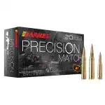 Precision Match, engineered for precision at extreme distances, features exceptionally low standard deviations and extreme variations due to Barnes' exacting manufacturing and quality standards. Precision Match rounds are loaded with a match grade OTM (Open Tip Match) BT projectile featuring a long boat tail and high B.C. As an additional bonus, scan the QR code located on the back of each box to view Doppler radar generated drop tables specific to each load.