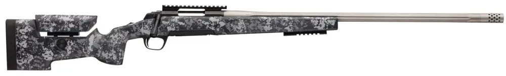Browning's X-Bolt builds on the proven successes of past Browning rifles, and adds numerous improvements. Its adjustable three-lever Feather Trigger system provides a clean, crisp pull with no take-up. The barrel is free-floated by bedding the front and rear of the action for stability and to help maintain barrel to stock spacing for consistent accuracy. A recessed muzzle crown helps protect the rifling from damage. The bolt unlock button works in conjunction with the top-tang safety to provide an added measure of safety, while the 60 degree bolt lift is fast cycling and allows you to work the bolt quickly. The Target model features a drilled and tapped, steel receiver with a 20 MOA Picatinny rail; free-floating bull, gray stainless steel, fluted barrel with muzzle brake and 5/8-24 threads; McMillan A3-5 with adjustable comb, textured gripping surfaces and Pachmayr Decelerator recoil pad. This model has a Urban Carbon Ambush camo finish on its stock and forend.