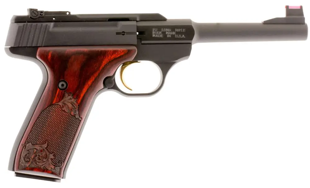 Browning's Buck Mark rimfire pistol leads the industry in quality, reliability, accuracy and variety. It is constructed of a solid piece of aircraft-grade 7075 aluminum alloy, and then CNC machined to exacting tolerances. The crisp single-action trigger, hand reamed chamber, target crowned barrel and finely adjustable target sights mean the Buck Mark comes ready for fun straight from the box. Its slide features built-in recess and raised side panels for better grip along with a manual slide release. The Buck Mark utilizes a Pro-Target rear sight and a manual thumb safety.