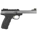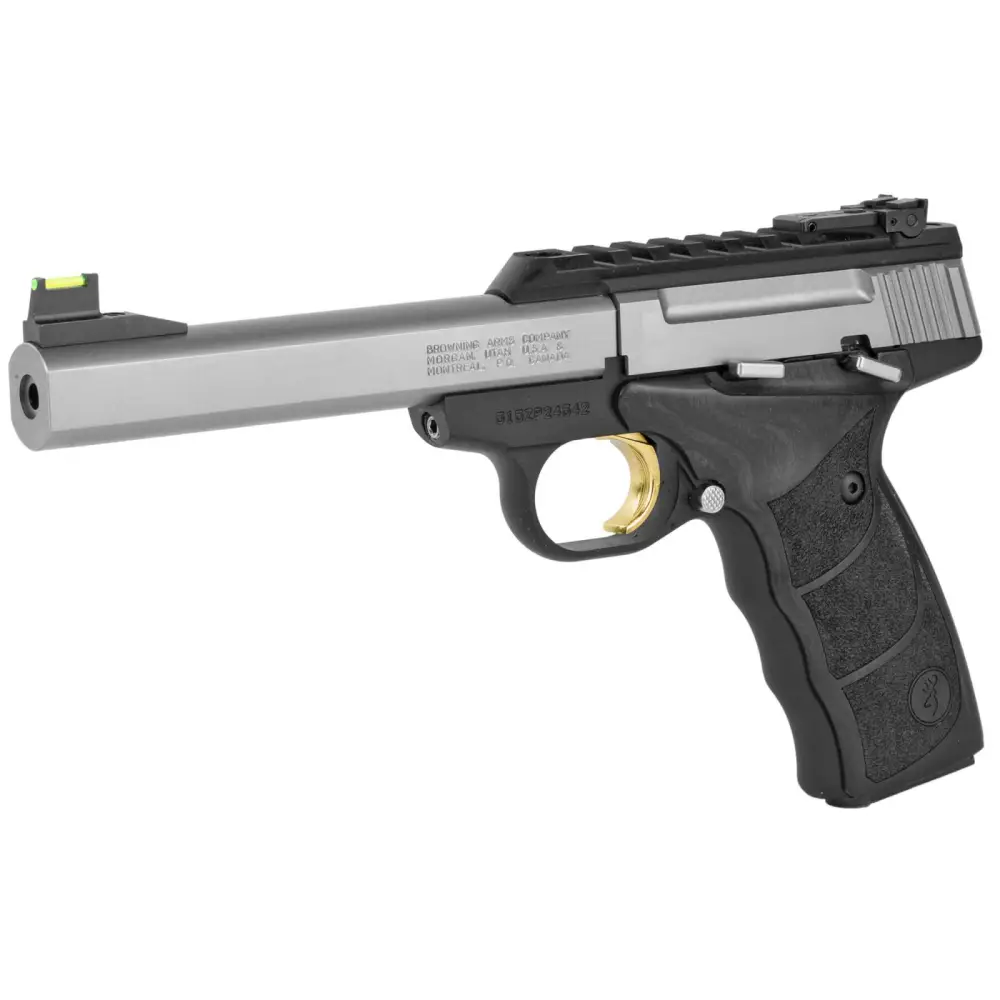 Browning's Buck Mark rimfire pistol leads the industry in quality, reliability, accuracy and variety. It is constructed of a solid piece of aircraft-grade 7075 aluminum alloy, and then CNC machined to exacting tolerances. The crisp single-action trigger, hand reamed chamber, target crowned barrel and finely adjustable target sights mean the Buck Mark comes ready for fun straight from the box. Its slide features built-in recess and raised side panels for better grip along with a manual slide release. The Buck Mark utilizes a Pro-Target rear sight and a manual thumb safety. The Plus has the features you want with looks you can't resist. It features a slab side barrel with highly polished flats and a top Picatinny rail. This model has a stainless steel barrel and slide, black aluminum alloy frame, and UDX laminate black wood grips.