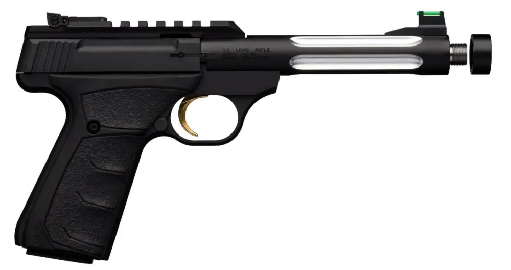 Browning's Buck Mark rimfire pistol leads the industry in quality, reliability, accuracy and variety. It is constructed of a solid piece of aircraft-grade 7075 aluminum alloy, and then CNC machined to exacting tolerances. The crisp single-action trigger, hand reamed chamber, target crowned barrel and finely adjustable target sights mean the Buck Mark comes ready for fun straight from the box. Its slide features built-in recess and raised side panels for better grip along with a manual slide release. The Buck Mark utilizes a Pro-Target rear sight and a manual thumb safety. The Plus Lite model has a solid reputation for performance and accuracy and is a favorite of hunters and practical shooting competitors alike. It features an aluminum alloy frame and slide, steel barrel with an aluminum sleeve and steel liner, single-action trigger, and a Picatinny rail. This Suppressor ready model has a 1/2-28" threaded barrel with fluting and Ultragrip FX grips.