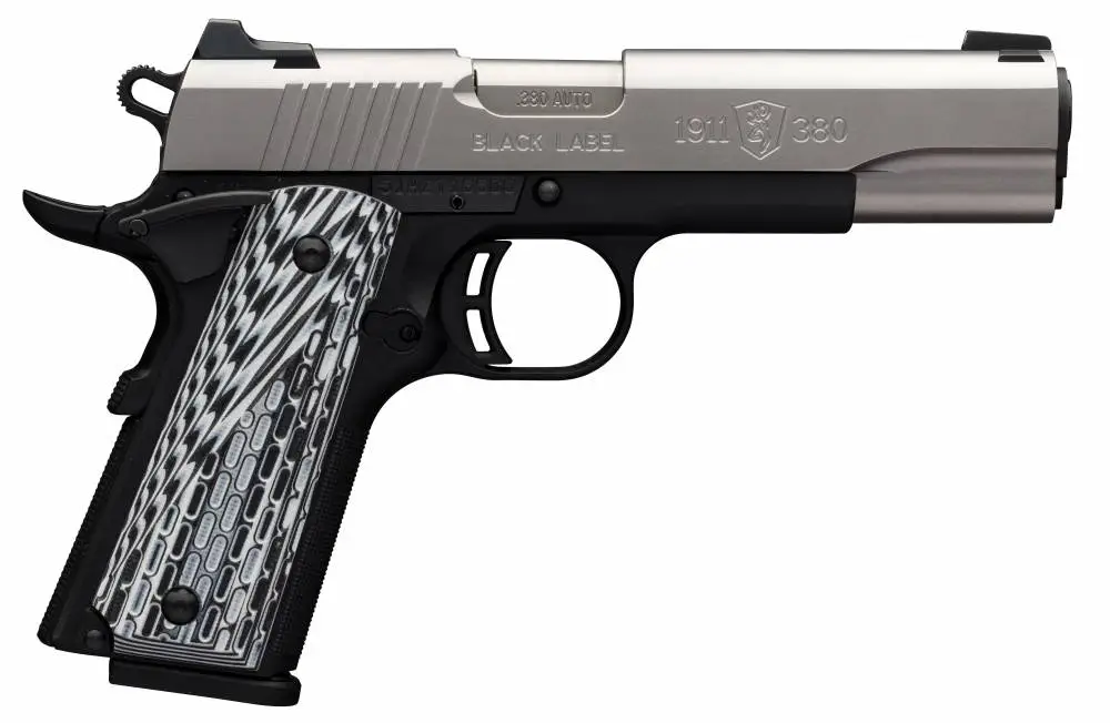 Browning's 1911-380 is 15% smaller than the 45 ACP models and the ideal choice for concealed carry, home protection, shooters. It allows for more comfortable shooting, control, and accurate follow-up shots. The natural grip angle offers instinctual pointing, while a low bore axis provides excellent recoil control and shooting comfort. It has a flat profile, single-action trigger, longer slide and barrel, ambidextrous manual thumb and grip safety, and a steel magazine. This Black Label Pro model has a composite frame with a 7075 aluminum subframe and slide rails. It utilizes a 4.25" barrel, stainless steel slide with 3-dot combat sights, black/white G-10 grips, and includes two 8-round magazines and an ABS carry case.