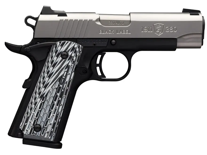 Browning's 1911-380 is 15% smaller than the 45 ACP models and the ideal choice for concealed carry, home protection, shooters. It allows for more comfortable shooting, control, and accurate follow-up shots. The natural grip angle offers instinctual pointing, while a low bore axis provides excellent recoil control and shooting comfort. It has a flat profile, single-action trigger, longer slide and barrel, ambidextrous manual thumb and grip safety, and a steel magazine. This Black Label Pro Compact model has a composite frame with a 7075 aluminum subframe and slide rails. It utilizes a 3.625" barrel, stainless steel slide with 3-dot combat sights, black/white G-10 grips, and includes two 8-round magazines and an ABS carry case.