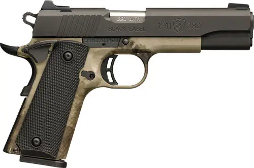 The 1911-380 Black Label Pro Speed model has a composite frame with 7075 aluminum sub-frame and a machined stainless steel slide. Its single-action trigger that provides a light, crisp pull that allows for excellent accuracy.