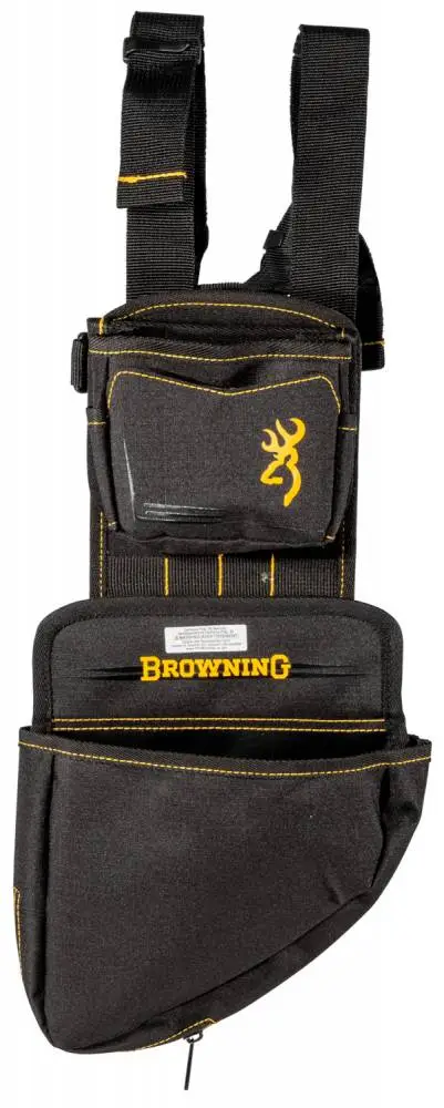 The Browning Black and Gold Pouch is constructed with water-resistant black ripstop fabric with contrasting gold stitching. The large fired hull pouch and shell box holder attach to the semi-rigid Molle platform or each item may be used individually. Adjustable belt with quick release button.