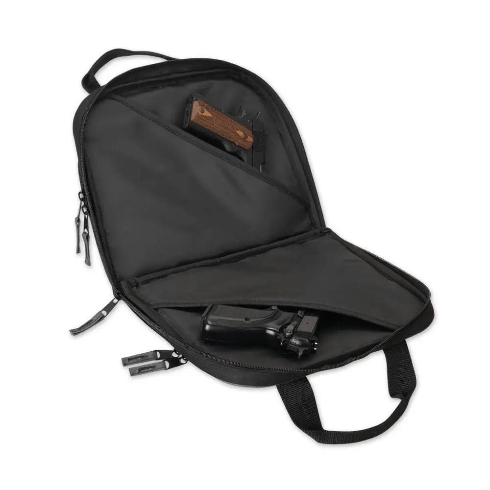 Browning's Crossfire Double Pistol case is the perfect pistol case for holding two pistols and still provides great protection for both. It allows you to carry your pistols to the range or out to your favorite shooting spot, snug and unscratched. The case is constructed of 600D polyester with smooth face nylon fabric lining and closed-cell foam padding. It has two padded interior pockets, two large zippered side pockets, one with five magazine storage slots, the other with three ammo box and accessory slots, plus two exterior pockets with hook and loop closures for smaller flat items. The Crossfire Double Pistol case also utilizes double pull zippers with nylon pull tabs, fully-bound sewn edges and sewn web carry handles.