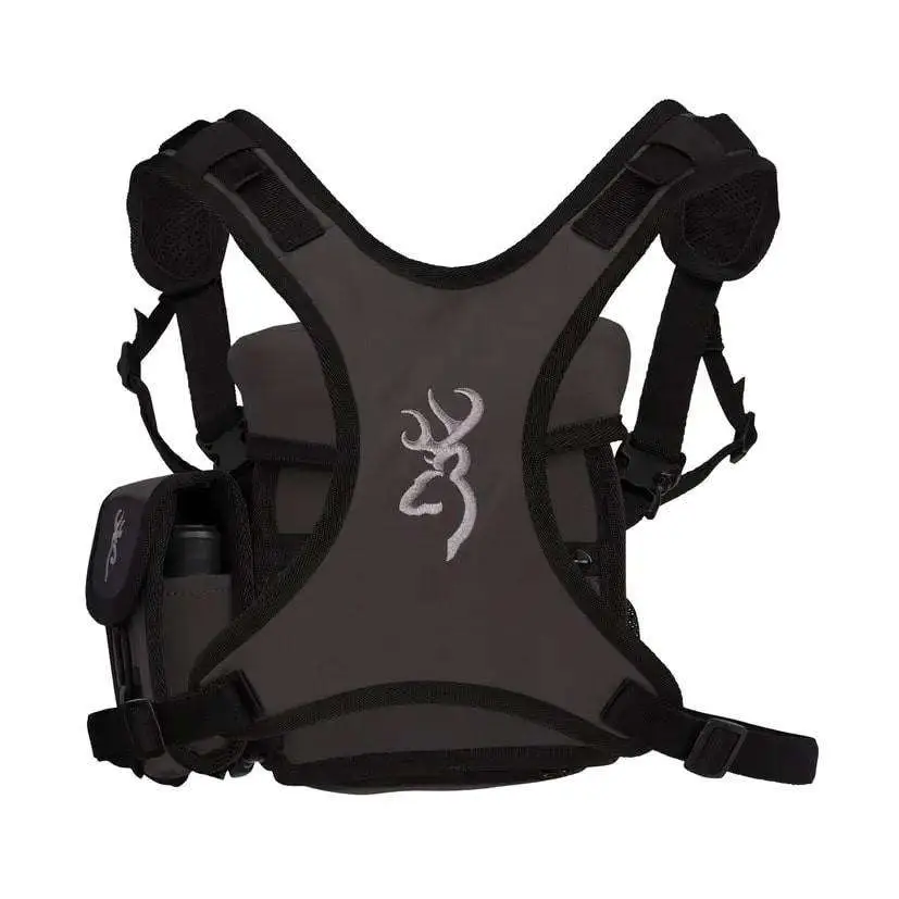 The Browning Bino Hub has an adjustable double strap harness with four quick release buckles spreads weight over both shoulders to help prevent neck fatigue. Laminated fabric and protective foam padding on main compartment. Concealed rain fly and full-coverage top flap with magnetic closure for quick access. Detachable rangefinder side pocket.