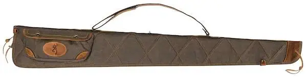 Browning's Lona Rifle Case is quilted of 100 percent cotton canvas for classic look with plush red flannel lining, double pull zipper, leather trim and binding. It utilizes closed-cell foam, aged leather muzzle cap, leather shoulder strap, Brass hardware, and a stamped Buckmark. The case also features a snap closure. This 52" model has a flint/brown finish and side pocket with shell or choke tube loops.