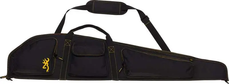 Browning's new flexible Black and Gold gun cases are polyurethane coated and water resistant. Made with black ripstop fabric with contrasting gold stitching and trim with a gold stitched Browning logo and high density open cell foam padding. Double -pull main zipper, two zippered side pockets and one flapped pocket with hook and loop closure, padded shoulder strap.