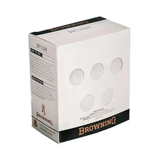 Browning's Dry-Zone Moisture Reducer provides instant protection from moisture/humidity. It absorbs moisture without electricity, and is rechargeable in an oven. One 500-gram box protects up to 37 cubic feet of enclosed space, about the volume of a standard 30" wide safe.