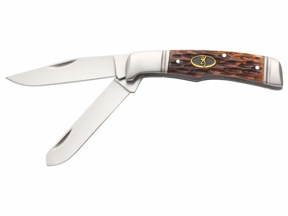 Browning's Joint Venture is a traditional slip joint folding knife with 8Cr13MoV stainless steel blade and features a Buckmark medallion. This model has a jigged bone handle scales with stainless bolster.