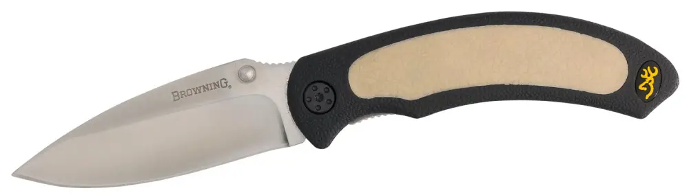 Browning's Cayman knife is a simple design using double injection polymer molding to give you a good looking folding pocket knife with a grip that is easy to hold onto. The 7Cr blade holds a keen edge and features a thumb stud for easy opening. It utilizes a thumb stud, anodized aluminum bolsters and a pocket clip. This model has a black/tan handle.