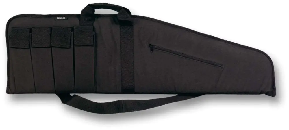 Bulldog's Extreme Tactical Rifle Case is constructed of durable, heavy-duty nylon, water-resistant outer shell, heavy-duty double stitching, and a #10 heavy-duty, full-length zipper with pull. It has a zippered accessory pocket, and a laminated Tricot, heat-resistant inner lining, and a total of 2.25" soft padding. The Extreme Tactical case has four Velcro-close external magazine pouches, and a removable, adjustable shoulder strap with swivels.