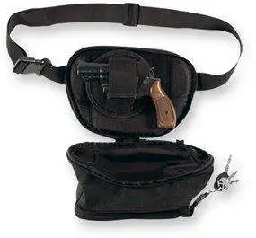 The Fanny Pack Pistol Holster by Bulldog is an ambidextrous universal holster with a full-length zipper and nylon wrap-around carry straps. This model is made with heavy-duty Nylon, and the outer shell is water-resistant. There is 1.75"-thick soft padding.