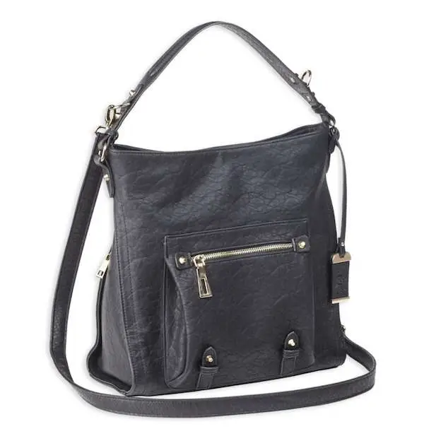 Bulldog's Hobo Ana style purse features a magnetic main compartment with multiple inner pockets and zippered front accessory pocket. It also has a flat padded shoulder handle with a removable cross body strap, and is compatible with most small autos and revolvers.