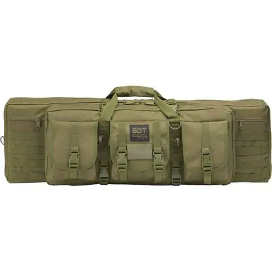 Bulldog's Tactical Rifle Case features a lockable zippered rifle compartment with adjustable Velcro tie downs and quilted lining. It is constructed of a heavy-duty nylon with oversized metal zippers and pulls, deluxe padded backpack straps, and three high-vis lined accessory pockets for added visibility. The case also has a lockable zippered accessory and extra magazine compartment as well as a padded internal divider which allows for double the rifle storage.