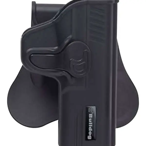 Bulldog's Rapid Release Holster is suitable for civilian, duty and military use. The holster is made of durable, high-tech polymer material with gun-specific design that is fully adjustable to multiple draw positions. Its specially designed locking mechanism provides safe and secure "Level II" retention while offering a one finger "Quick Draw" release.