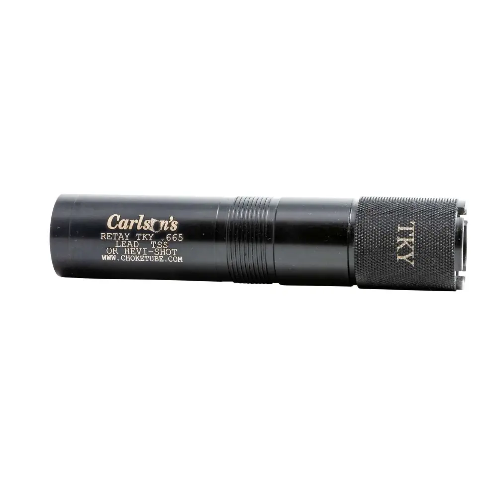 Carlson's Extended Turkey Choke extend approximately 1" from the end of the barrel. It is manufactured from 17-4 heat treated stainless steel to withstand heavy buffered Turkey Shotshells. It also produces extra tight patterns with copper plated and buffered lead turkey shotshells.