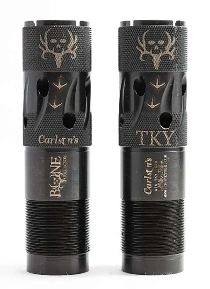 Carlsons Ported Bone Collector Turkey Choke Tubes feature a super tight, pattern tested constriction that throws extremely tight patterns with all shotshell ammunition loaded for turkey hunting including lead, nickel-plated, copperplated, bismuth, hevi-shot, tungsten, and TSS. A longer taper section to the constriction (parallel section of choke tube) insure tight patterns with less flyers. More pellets on target every shot! The Bone Collector Choke tubes are precision-machined from 17-4 heat treated stainless steel and feature a non-reflective matte black finish. Each choke tube constriction has been pattern tested and has thrown the best patterns with 4 through 10 shot. If you wish to use shot sizes larger than #4 shot, use a more open choke tube for optimum patterning. Remember to pattern your shotgun choke tube with the specific shot shell load you are going to be using. Different types and manufacturers of ammunition will throw different patterns from the same choke tube.