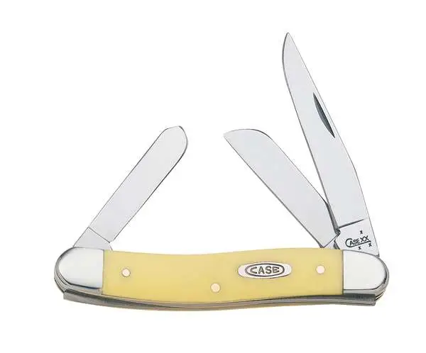 The smooth, yellow synthetic handles of this medium-sized Stockman folding knife are built to take abuse. The clip, sheepsfoot and spey blades are stamped from chrome vanadium steel, a special formula of alloyed cutlery steel for easier resharpening.