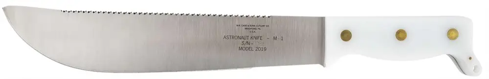To celebrate mans very first steps on the Moon, Case has carefully crafted a reproduction featuring a 11 inch taper ground, high carbon stainless steel machete blade and a smooth white synthetic handle. The Case Astronaut Knife M-1 spans a total of 17 inches from base to blade tip and weighs 10.8 ounces. The knife is packaged in a two-piece box and features consecutive serialization on the blade.