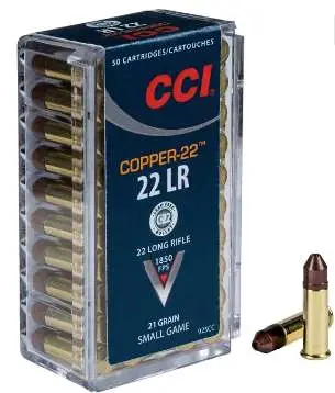 You'll enjoy accurate, reliable performance on targets and small game in a non-lead bullet with Copper-22. The projectile is constructed from a unique mix of copper particles and polymer compressed into a potent, 21-grain hollow-point bullet. Combined with CCI's reliable priming and propellant, Copper-22 loads achieve a muzzle velocity of 1,850 fps and provide superb accuracy.