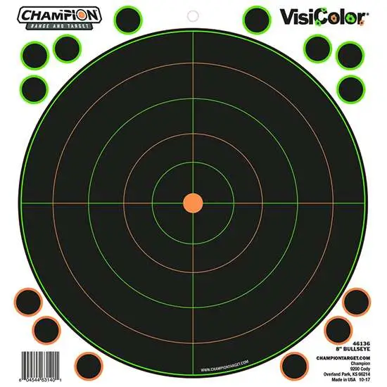 Peel-and-stick Champion VisiColor Adhesive targets create an instant shooting range. Multi-color impact halos help shooters track specific shot placement. This pack comes with a 8" bullseye target per page and pasters. It has dimensions of 8.5" x 9".