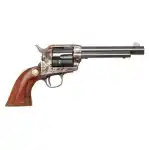 The 1873 peacemaker-style revolver, originally designed for the U.S. Cavalry, quickly became the archetypical sixgun of the frontier. Made in a number of powerful chamberings in different barrel lengths, besides the "peacemaker," it was also known by other monikers like "hogleg," smokewagon," and "equalizer." In civilian hands, it quickly earned a reputation as a rugged, hard-hitting, well balanced revolver and outsold all competitors. Men like Wyatt Earp, Bat Masterson, John Selman, the James-Younger gang, the Daltons, the Texas and later the Arizona Rangers, all packed this legendary arm and did their smoky work with it. With the coming of the Silver Screen, the Model P was reintroduced to an entirely new generation of admirers. In the hands of such Western stars as John Wayne, Roy Rogers, Hopalong Cassidy, Tom Selleck, Clint Eastwood and countless others, this sixgun has earned lasting fame with shooters and Old West fans alike! Considered as the most authentic and highest quality reproduction of the 1873 Colt, Cimarron's replica was reproduced in every detail from an original 1873 single action in our antique collection, and was not replicated by working simply from drawings, as with previous reproductions. We also took extra steps to improve the gun's reliability with our Cowboy Comp action which eliminates weaknesses associated with the 19th century design.