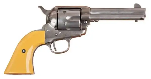 Arguably the most recognizable sixgun in western movie history, Cimarron Firearms went to great lengths to reproduce John Wayne's famous sidearm, used in so many of his trail dust sagas. Copied in every detail from Duke's own Colt, this ain't no gussied up six-shooter wearing a fancy finish, with engraving and pictures plastered all over it, rather it boasts of a trail worn, plain finish, with the bluing worn completely off, just like the gun JW packed when taming the silver screen. It even sports the authentically reproduced, aged-looking yellowed grips with the finger grooves! Made by Uberti in .45 Colt caliber, this 4 3/4-inch barreled single action is an exact twin to Big John's original motion picture shooting iron. From the mid-1960s on, our hero packed a gun like this in nearly every one of his great westerns, including such classics as Chisum, Big Jake, Rooster Cogburn, and his Oscar-winning performance in True Grit. As Duke might say, "This just suits your pistol!"