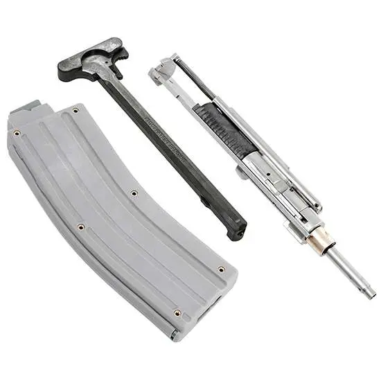 This AR converstion kit is made of stainless steel, includes a anti-jam charging handle, cleaning jag guide rod, forward assist adaptor, and a 25rd magazine.