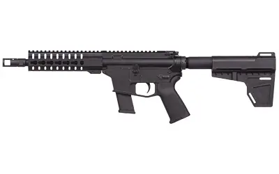 CMMG's MkG Guard is an AR15-style pistol chambered in 45 ACP. The Guard is fed from factory Glock 21 magazines and uses CMMG's patent pending Radial Delayed Blowback operating system that tames the 45 ACP cartridge while simultaneously reducing the weight and felt recoil of the rifle. It also features a patent pending dual-pinned, fully machined bolt catch linkage, making operation of the rifle both easy and intuitive. The Guard is threaded (.578"-28 tpi) to accept most common 45 ACP suppressors, and is the perfect carbine for defending your home or enjoying a day at the range. The barrel is 4140 steel with a medium taper, 1:16" twist, and a black SBN (Salt Bath Nitride) finish capped with CMMG's SV muzzle brake. It has a forged 7075-T6 aluminum upper receiver with a billet 7075-T6 aluminum lower receiver, and CMMG's single stage mil-spec style trigger. This model has a black KAK Shockwave Blade stabilizer and tube, Magpul MOE pistol grip, 8" barrel, and CMMG's free-floating 7" keymod handguard.