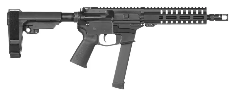 The Banshee 200 is the lightest and most compact AR pistol firearm. It features 7075-T6 aluminum receivers, single-stage trigger, standard safety selector, and a Mil-Spec charging handle. The barrel has a nitride finish and CMMG SV muzzle brake. The Banshee 200 also has a M-Lok free-float handguard and hardcoat anodized finish. This MKGS model features an 8" medium taper barrel, Magpul MOE grip, 6-position CMMG RipBrace, integrated trigger guard, and a 33-round Glock style magazine.