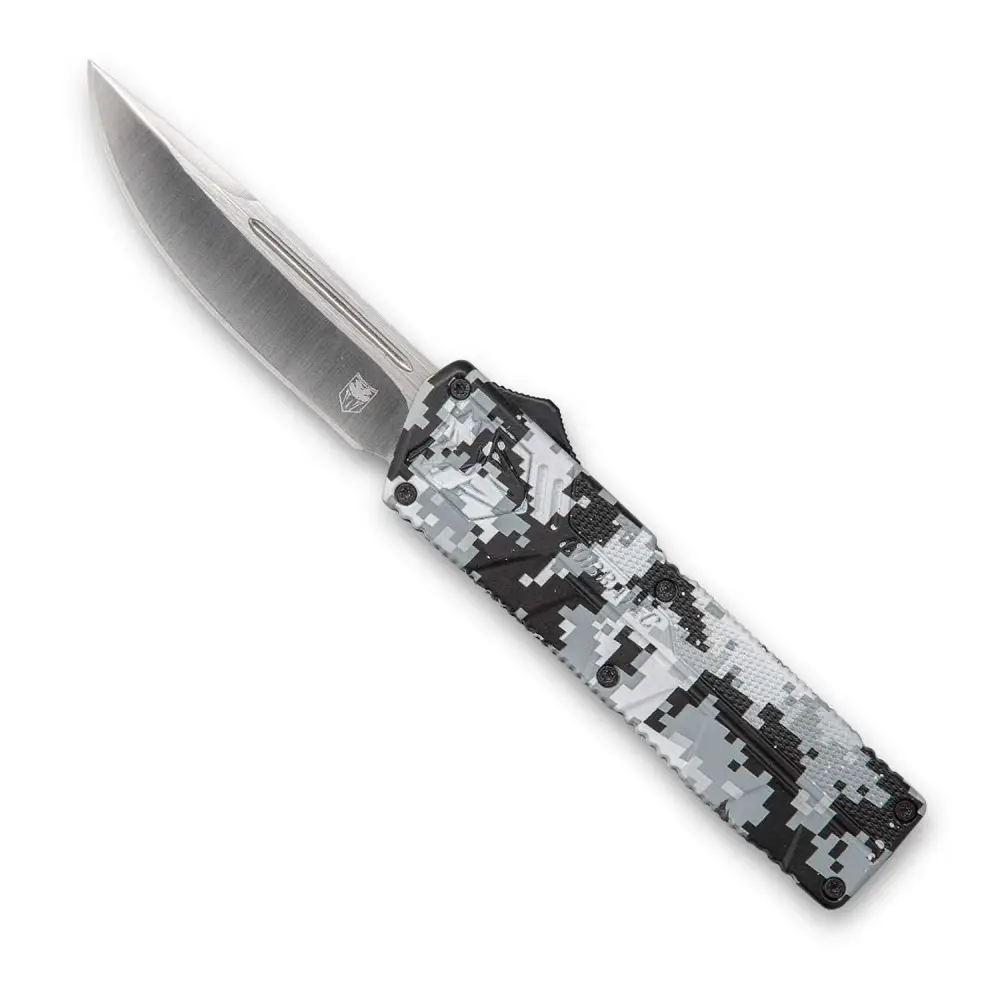 Introducing the Lightweight Winter Digi Camo (out the front) knife. With a great feel and excellent action, it's suited for everyday usage. This knife features a pocket clip and a nylon sheath. It also features a 3.25" D2 Steel blade, and 4.5" high-grade aluminum alloy handle, and it is dual action OTF (offer the front).