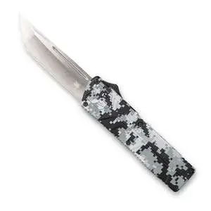 Introducing the Lightweight Winter Digi Camo (out the front) knife. With a great feel and excellent action, it's suited for everyday usage. This knife features a pocket clip and a nylon sheath. It also features a 3.25" D2 Steel blade, and 4.5" high-grade aluminum alloy handle, and it is dual action OTF (offer the front).