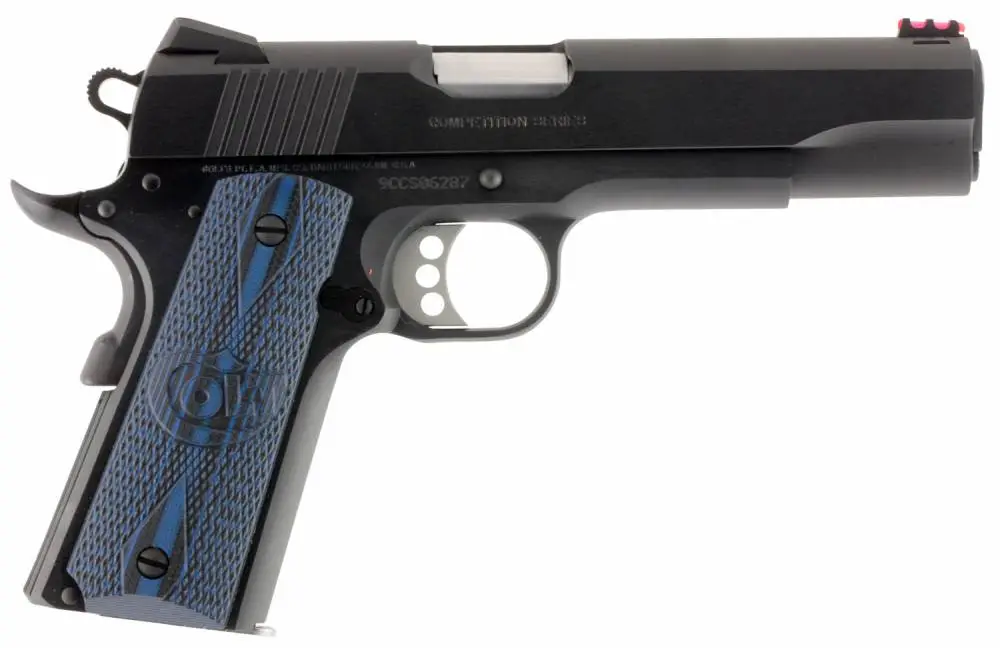 Colt's 1911 Competition pistol features custom G10 blue grips with a scallop design, dual recoil spring system, a National Match barrel, and Novak adjustable fiber optic sights for precision shooting. It comes with two magazines and spare sight fibers.