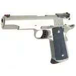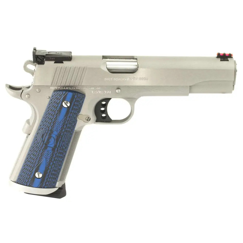 The Colt Gold Cup is known as the finest shooting semi-automatic in the world and has become the standard for a competitive 1911. It features the Gold Cup Series 70 wide target trigger, fully adjustable Bomar-style rear sight and red fiber optic front sight. Comes with 1 magazine. This 45 ACP model has a round top matte stainless steel slide and frame with blue/black G10 grips.