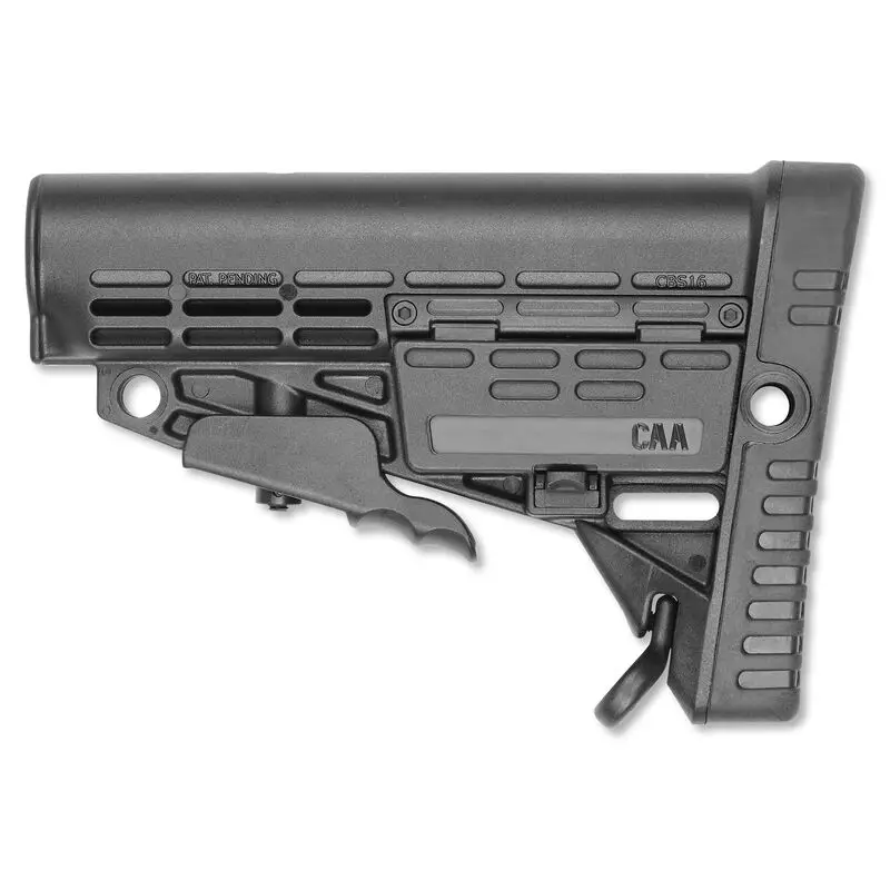 Rugged polymer collapsible stock for AR-15, a side Picatinny rail and storage for four 3 volt lithium batteries. Includes traditional sling mount and hole for quick release sling adapters (not included).
