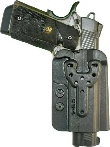 The QB is an outside the waistband holster perfect for general range use, competition or concealed carry. The QB has a quick on and off attachment and will work in any competitive shooting sport.The all Kydex body provides a rigid material that is custom fit to each firearm and maintains its shape even with the pistol un-holstered. The open ended body allows use of firearms of varying lengths.The dual sided multi option mounting block allows user to wear left or right handed. The mount holes are compatible with all industry mounting options for belt, molle or thigh holsters. The holster accommodates up to .5 high night sights, suppressor sights and rear sight mounted optics. It has a push-button mount for fast, simple attachment to belts, easy to adjust belt width, locking button for worry free security and multiple holes for 270 cant adjustment This holster is approved for use in all competitive shooting sports: USPSA, IDPA, 3 Gun. The size 4 holster fits- 1911s; Colt; Remington; Kimber; Sprinfield all models including TRP half and full rail; all Mil-Spec.