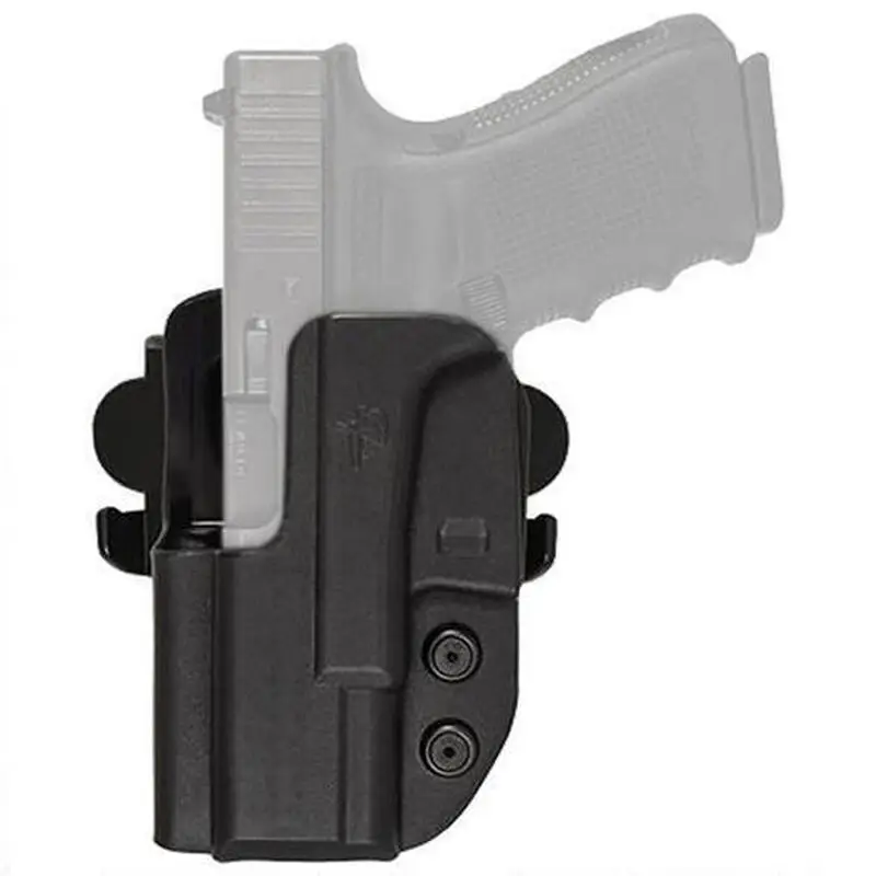 The International is an outside the waistband (OWB) holster ideal for competition shooting, concealed carry or general use. It is cut down in the front to fit most optic sight and has a .5" tall sight rail to fit most suppressor/optic co-witnessing sights. The all-Kydex body provides a rigid material that is custom fit to each firearm and maintains its shape even with the pistol un-holstered. The smooth, low friction surface allows for a fast draw and easy one-handed re-holstering of the firearm. With a modular mounting design giving the user 16 holster options in 1. The International includes belt mount, paddle mount and drop offset piece options. It's cant adjustable, belt width adjustable 1.5" - 2" and retention adjustable. Note-Once the adjustment tab has been removed it cannot be reattached.This model is compatible with Glock 17/22/31 G5.