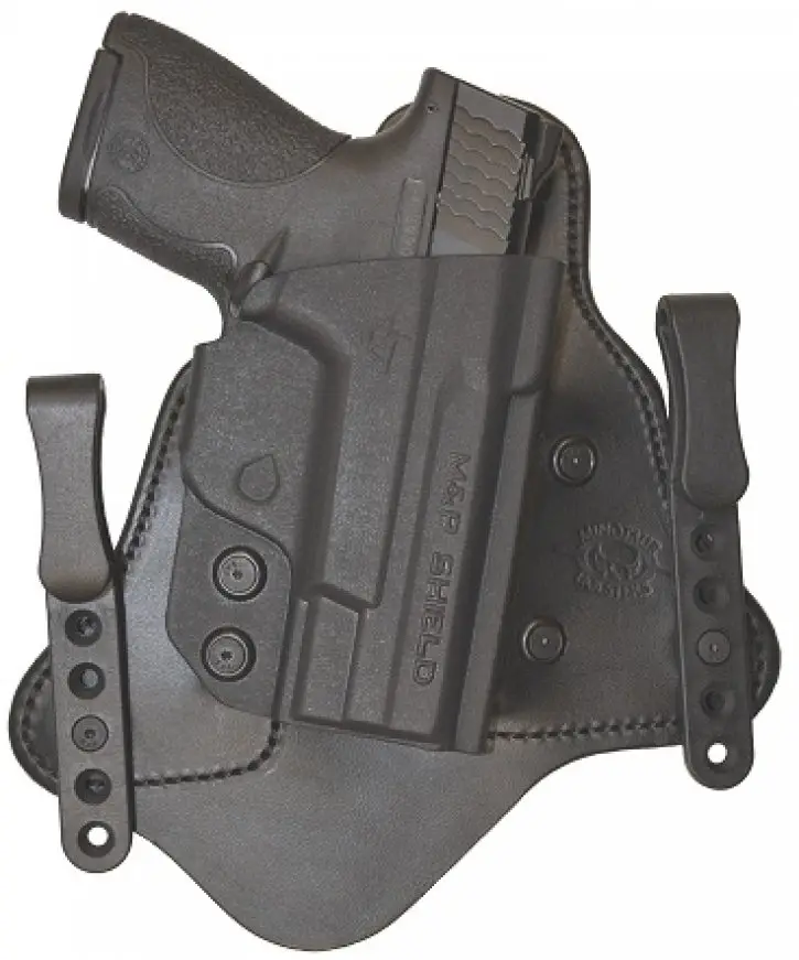 The MTAC is an inside the waistband holster created to be worn behind the hip at 4:00 or 5:00, the holster offers the best in comfort and speed for concealed carry use. The Kydex hybrid holster has two layers of top grain leather cowhide backing making it comfortable to wear against your skin. The Kydex body on the MTAC provides a rigid material that is custom fit to each firearm and maintains its shape even with the pistol un-holstered. The smooth, low friction surface allows for a fast draw and easy one-handed re-holstering of the firearm. The MTAC's Kydex body is also interchangeable.The MTAC attaches to the belt by 1.5" black standard clips mounted to the leather tabs on either side of the holster. These mounting clips distribute the weight of the loaded pistol while holding securely to the belt. The clips will also allow for ride depth or cant adjustment by using the different mounting holes. Fits S&W MP shield 9mm/40.