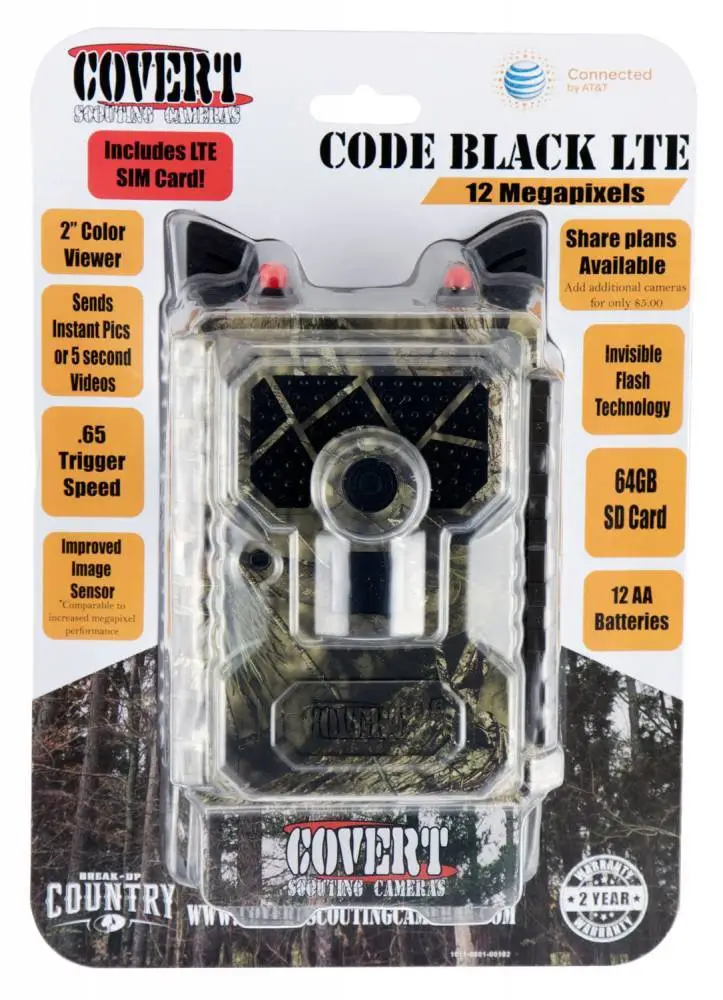Covert Trail Cameras continues to revolutionize the wireless camera industry. The Code Black LTE continues with the ability to send texts, emails or both within the Covert Wireless mobile app and web-portal. The app includes guest access abilities and the power to retrieve high resolution images. It sends instant pictures or five second videos using an approved cellular network. The camera features 12 megapixels, 100 foot flash range, Invisible flash technology, Maximum Silence Image Capture and up to 32GB SD card. SD card not included.